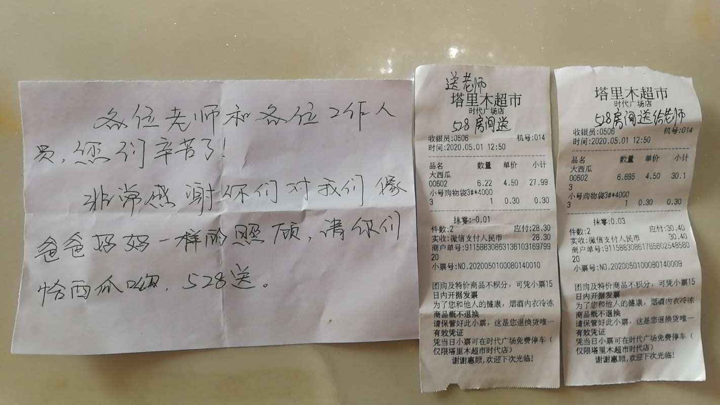 5月2日上午,银都宾馆负责老师贾强,收到来自广电2019级陈韵宇、物流管理21-2班贺杰,送来的两个西瓜。
