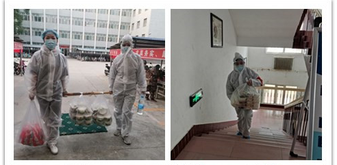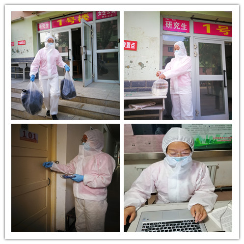 “老师,我的拖鞋和暖瓶在二楼原宿舍,能帮忙取一下吗?”,“老师,我订的外卖在楼下,能帮忙到一下吗?”,每天类似这样取东西、送东西的工作让每一位老师都格外忙碌。老师们不知道在楼栋中上上下下往返了多少趟,在防护服的包裹下,老师们经常是大汗淋漓,甚至护目镜中的气雾会糢糊了老师们的视线,但这些困难都档不住为学生服务的步伐。每当看到学生笑,听到学生道一句“谢谢老师,老师辛苦了”,老师们就觉得这一切都值了。