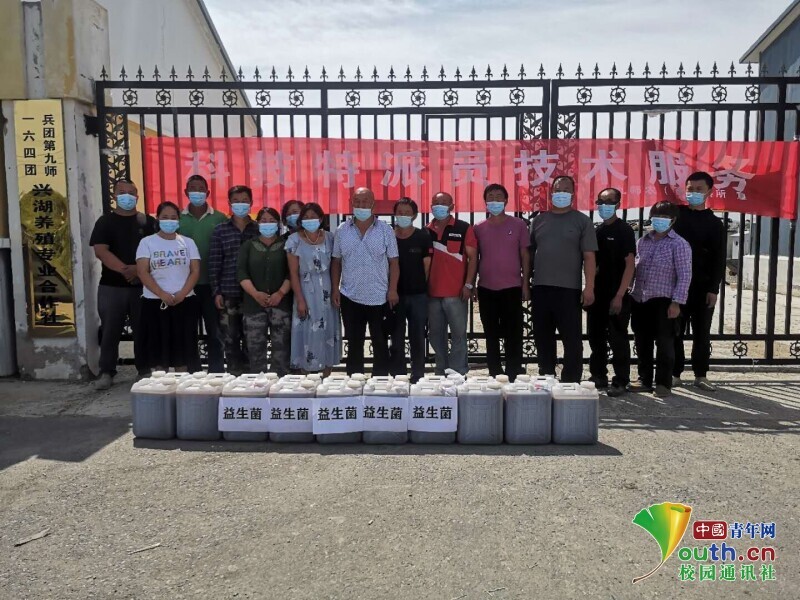 图为第九师农(畜)科所的科技特派员和塔大师生们到达第九师兴湖养殖专业合作社送物资、准备开展服务的合照。中国青年网通讯员 王云峰 摄
